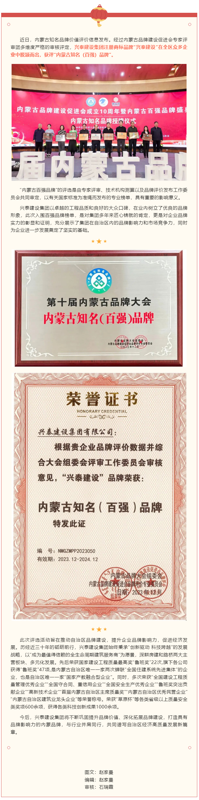 “兴泰建设”喜获内蒙古知名(百强)品牌荣誉